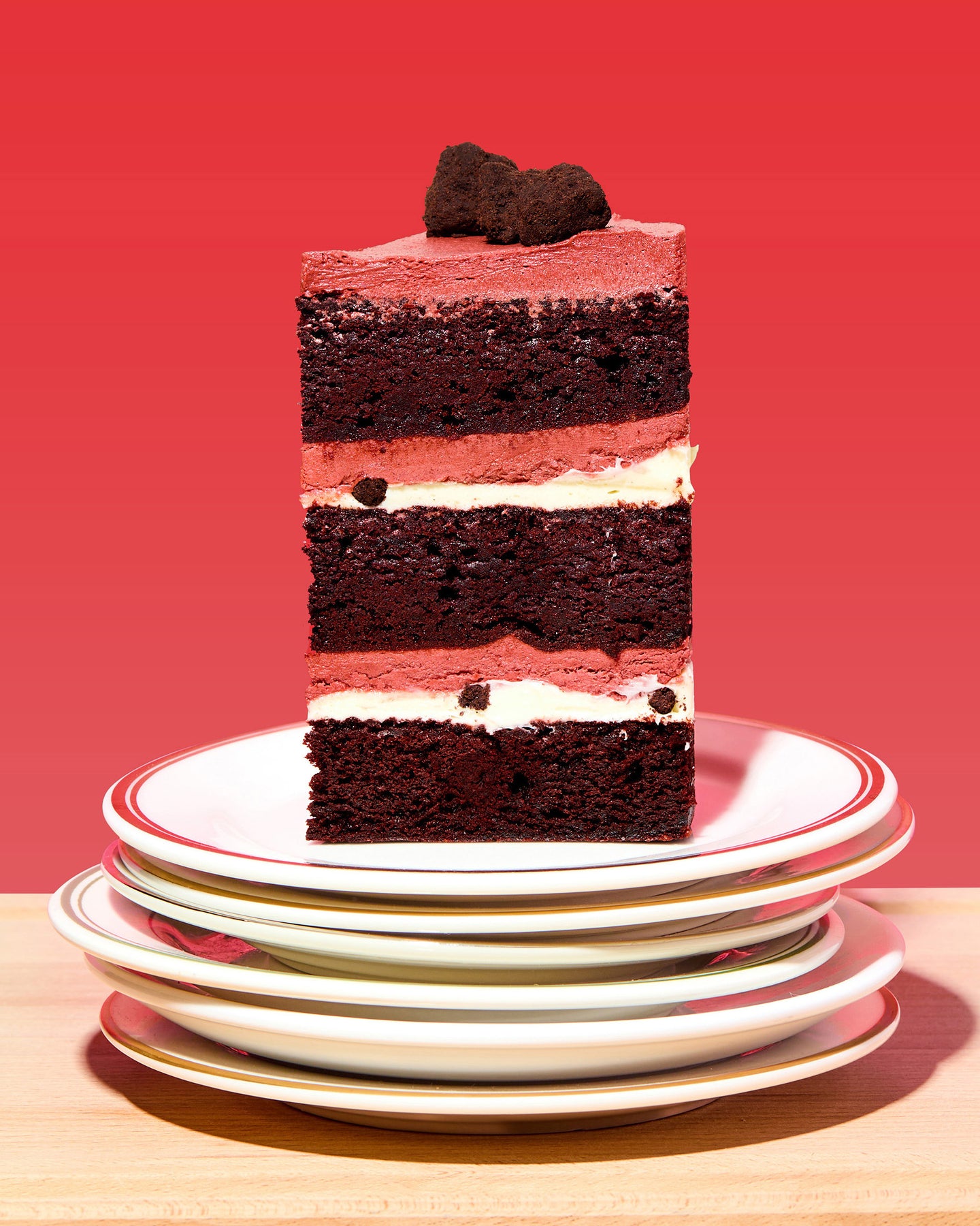 A twist on the cake classic. Decadent chocolate cake meets layers of cheesecake filling and chocolate frosting for a cake and cake truffles that are anything but shy.