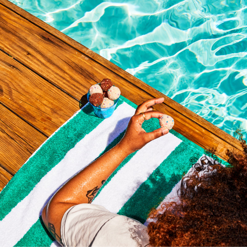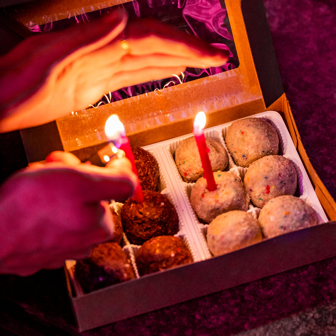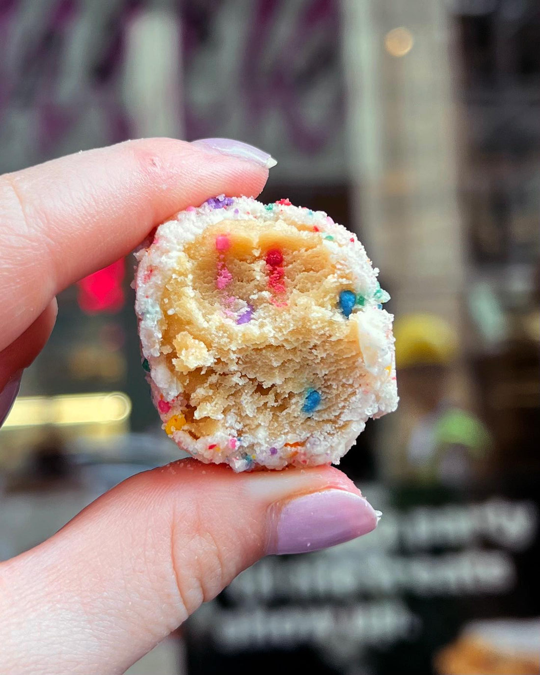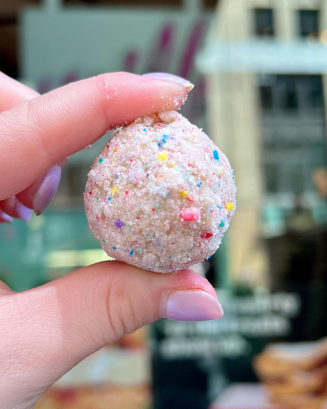 We rolled all the childhood flavor of our signature cake into a single bite — no utensils needed. Made from Birthday Cake, these rainbow-flecked, vanilla-happy goodies are coated in a barely-there white chocolate shell and rolled in B'Day sand.